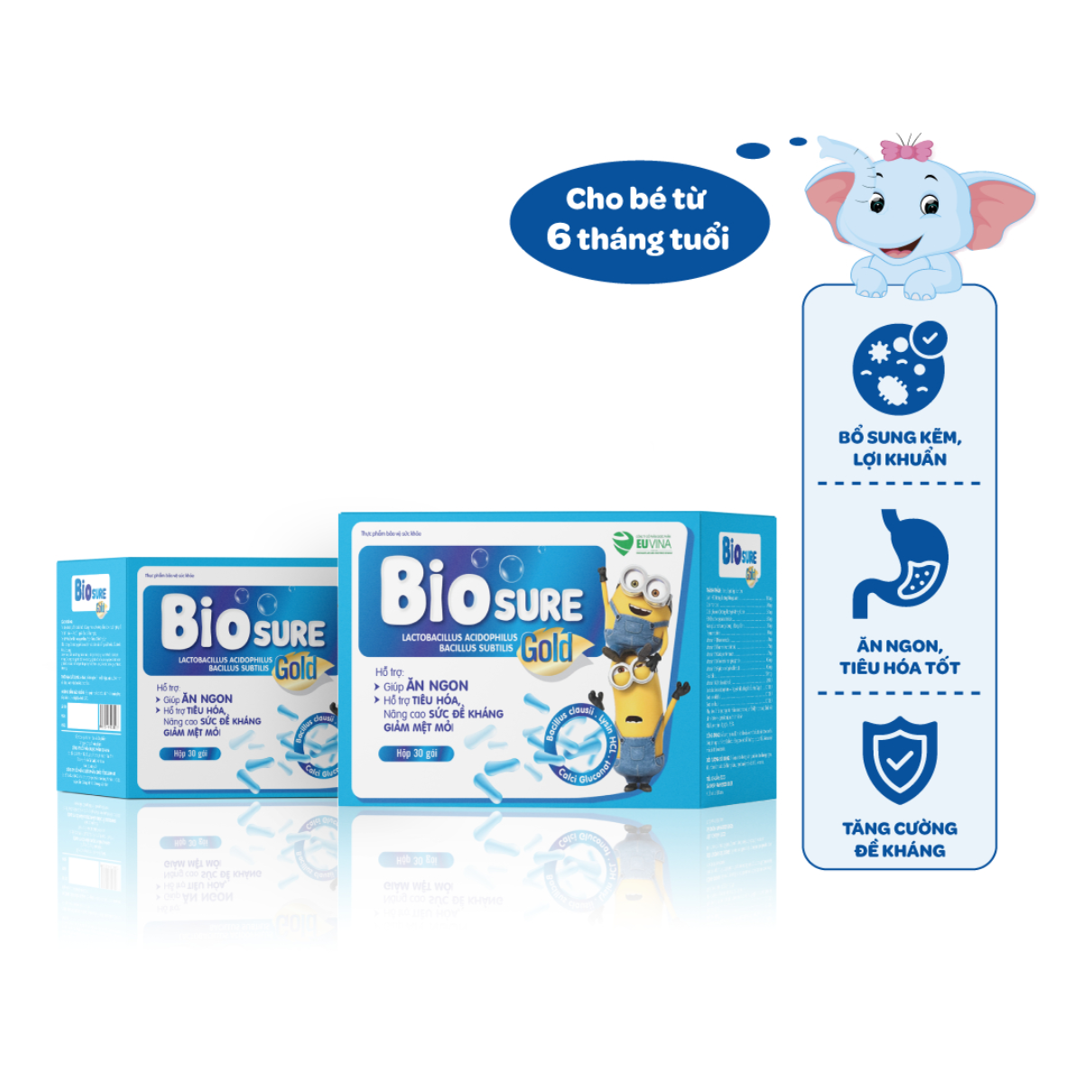- Biosure Gold bổ sung các vi khuẩn có lợi, hỗ trợ hệ vi sinh đường ruột, giúp cải thiện các triệu chứng rối loạn tiêu hóa như tiêu chảy, táo bón, đầy hơi, nôn trớ.