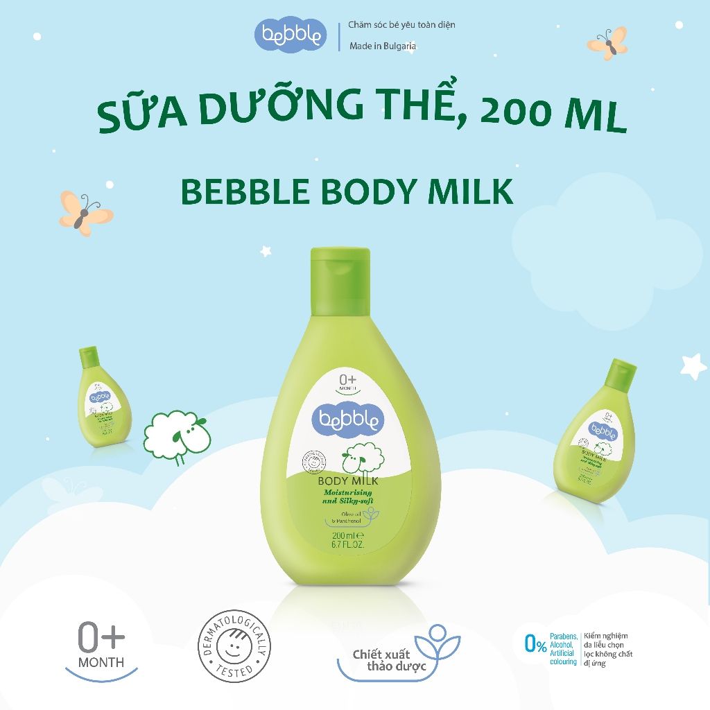 Sữa dưỡng ẩm toàn thân Bebble Body Milk 200ml có thành phần chính từ hoa cúc la mã và dầu ô liu, mang đến tác động vượt trội trong việc làm mềm và cung cấp độ ẩm cho da, đồng thời tạo nên những tác động tích cực trong việc điều trị các bệnh viêm nhiễm hay dị ứng. Sữa dưỡng ẩm Bebble sẽ thay bố mẹ bảo vệ bé, mang đến làn da mịn màng và hạn chế tối đa sự xâm nhập của vi khuẩn.